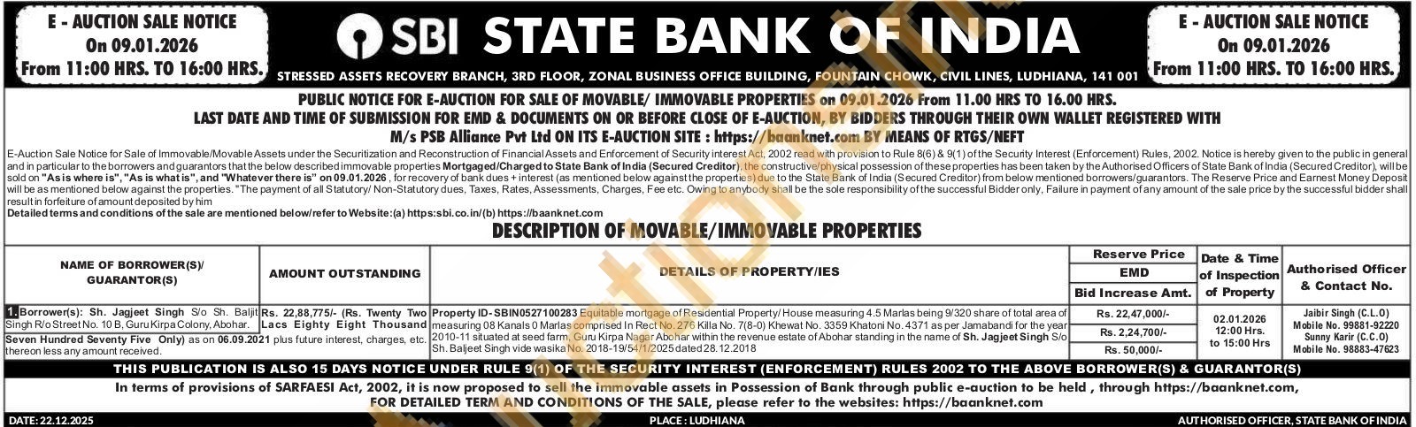 Property ID-SBIN0527100283 Equitable mortgage of Residential Property/House measuring 4.5 Marlas being 9/320 share of total area of measuring 08 Kanals 0 Marlas comprised In Rect No. 276 Killa No. 7(8-0) Khewat No. 3359 Khatoni No. 4371 as per Jamabandi for the year 2010-11 situated at seed farm, Guru Kirpa Nagar Abohar within the revenue estate of Abohar standing in the name of Sh. Jagjeet Singh S/o Sh. Baljeet Singh vide wasika No. 2018-19/54/1/2025 dated 28.12.2018