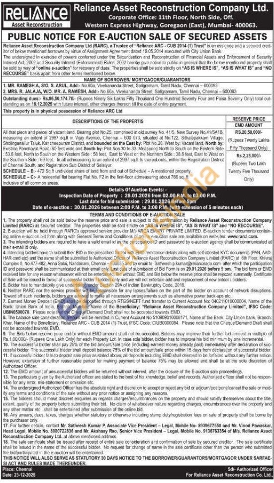 All that piece and parcel of vacant land. Bearing plot No.25, comprised in old survey No. 41/5, New Survey No.41/5418, measuring an extent of 2997 sq.ft in Vijay Avenue, Chennai 600 073, situated at No. 122, Sithalapakkam Vilage. Sholinganallur Taluk, Kancheepuram District, and bounded on the East by: Plot No 26, West by: Vacant land, North by: Existing Panchayat Road, 60 feet wide and South by: Plot Nos: 30 to 33. Measuring North to South on the Eastern Side 53.6 leet North to South on the Western Side: 58 leet, East to West on the Northem Side: 38.6 feet, East to West on the Southern Side 60 feet. In all admeasuring to an extent of 2997 sq ft to thereabouts, within the Registration District of Chennai South, and Registration Sub District of Selaiyur.