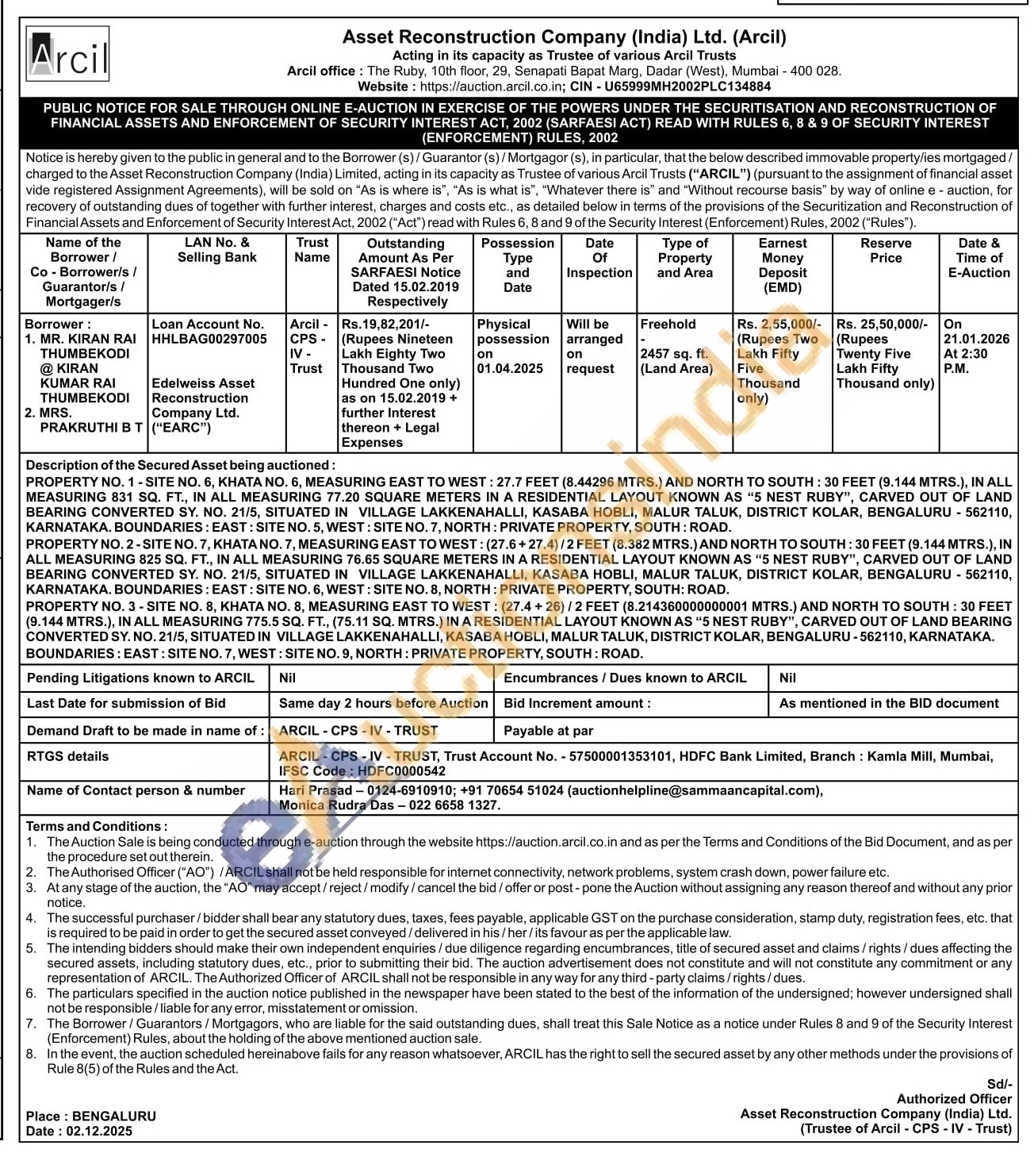SITE NO. 6, KHATA NO. 6, MEASURING EAST TO WEST: 27.7 FEET (8.44296 MTRS.) AND NORTH TO SOUTH: 30 FEET (9.144 MTRS.), IN ALL MEASURING 831 SQ. FT., IN ALL MEASURING 77.20 SQUARE METERS IN A RESIDENTIAL LAYOUT KNOWN AS "5 NEST RUBY", CARVED OUT OF LAND BEARING CONVERTED SY. NO. 21/5, SITUATED IN VILLAGE LAKKENAHALLI, KASABA HOBLI, MALUR TALUK, DISTRICT KOLAR, BENGALURU - 562110, KARNATAKA, BOUNDARIES: EAST: SITE NO. 5, WEST: SITE NO. 7, NORTH: PRIVATE PROPERTY, SOUTH: ROAD. PROPERTY NO. 2-SITE NO. 7, KHATA NO. 7, MEASURING EAST TO WEST: (27.6+27.4)/2 FEET (8.382 MTRS.) AND NORTH TO SOUTH: 30 FEET (9.144 MTRS.), IN ALL MEASURING 825 SQ. FT., IN ALL MEASURING 76.65 SQUARE METERS IN A RESIDENTIAL LAYOUT KNOWN AS "5 NEST RUBY", CARVED OUT OF LAND BEARING CONVERTED SY. NO. 21/5, SITUATED IN VILLAGE LAKKENAHALLI, KASABA HOBLI, MALUR TALUK, DISTRICT KOLAR, BENGALURU - 562110, KARNATAKA, BOUNDARIES: EAST: SITE NO. 6, WEST: SITE NO. 8, NORTH: PRIVATE PROPERTY, SOUTH: ROAD.