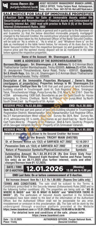 Description of the Immovable Properties Mortgaged/Owner's Name (mortgagers of property(ies): Properties belongs to Mr. Shanmugam,S/o Karuppannan Chettiyar Item No 1:All that part and parcel of land Residential building situated in Tiruchirapalli Joint III, Sub Registrar Office, Srirangam Taluk, Thiruchendurai Village, Punja Survey No. 216, New S. No.216/1 Door No 4/29A admeasuring 1308 Sqft. Boundaries as per the Deed: South by: House belonging to Chinna Chettiyar, North by Pillaiyar koil punja, West by:North South Street, East by: Property of Sh. Ayinan