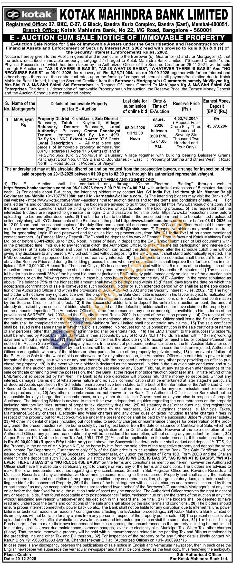Property District: Kozhikode, Sub District Taluk Koylandi, Village Local Balussery, Desom Balussery Authority: Balussery, Grama Panchayat Tenure: Jermom, Old Sy. No.: 4/3 .Sy.No. 662. Extent in Ares: 37.5 Centa Legal Description: All that a prece and 0.470 Hectares (1 A Re. Sy No 66/2 (Old Sy.No.49/3) in Balussery Village together with building bearing Balussery Grama Panchayat Door Noo 7/1459 B and C. Boundaries: East Property of Santha and others West North