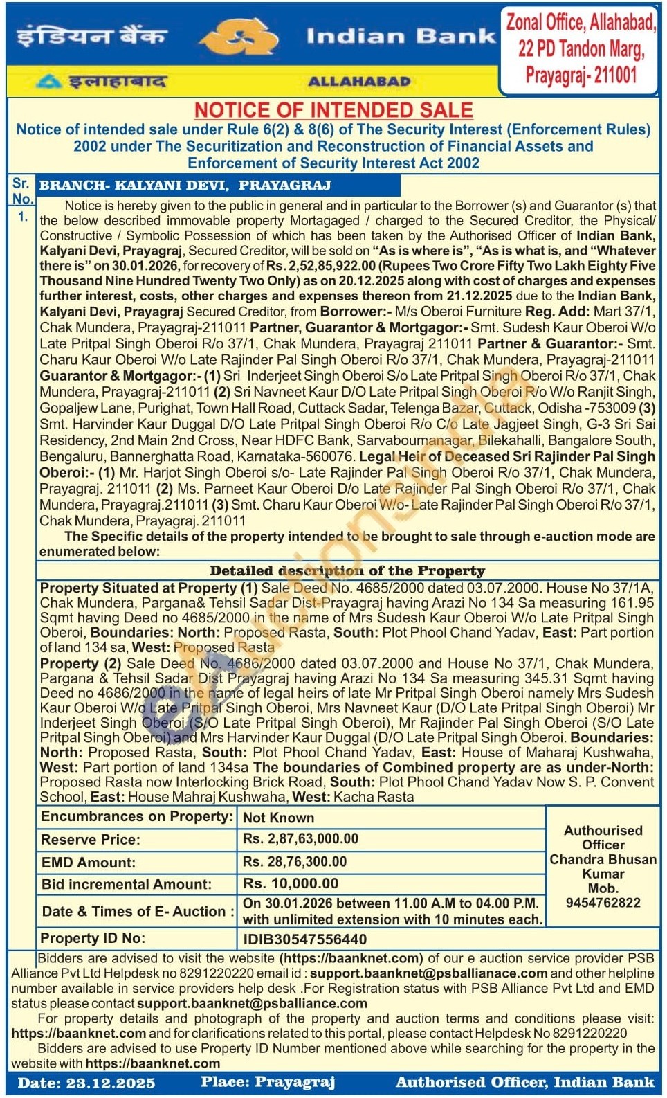 Property Situated at Property (1) Sale Deed No. 4685/2000 dated 03.07.2000, House No 37/1A, Chak Mundera, Pargana& Tehsil Sadar Dist-Prayagraj having Arazi No 134 Sa measuring 161.95 Sqmt having Deed no 4685/2000 in the name of Mrs Sudesh Kaur Oberoi W/o Late Pritpal Singh Oberoi, Boundaries: North: Proposed Rasta, South: Plot Phool Chand Yadav, East: Part portion of land 134 sa, West: Proposed Rasta Property (2) Sale Deed No. 4686/2000 dated 03.07.2000 and House No 37/1, Chak Mundera, Pargana & Tehsil Sadar Dist Prayagraj having Arazi No 134 Sa measuring 345.31 Sqmt having Deed no 4686/2000 in the name of legal heirs of late Mr Pritpal Singh Oberoi namely Mrs Sudesh Kaur Oberoi W/o Late Pritpal Singh Oberoi, Mrs Navneet Kaur (D/O Late Pritpal Singh Oberoi) Mr Inderjeet Singh Oberoi (S/O Late Pritpal Singh Oberoi), Mr Rajinder Pal Singh Oberoi (S/O Late Pritpal Singh Oberoi) and Mrs Harvinder Kaur Duggal (D/O Late Pritpal Singh Oberoi, Boundaries: North: Proposed Rasta, South: Plot Phool Chand Yadav, East: House of Maharaj Kushwaha, West: Part portion of land 134sa The boundaries of Combined property are as under-North: Proposed Rasta now Interlocking Brick Road, South: Plot Phool Chand Yadav Now S. P. Convent School, East: House Mahraj Kushwaha, West: Kacha Rasta