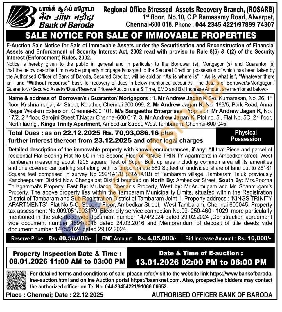 Detailed description of the immovable property with known encumbrances, if any: All that Piece and parcel of residential Flat Bearing Flat No 5C in the Second Floor of KINGS TRINITY Apartments in Ambedkar street, West Tambaram measuring about 1205 square feet of Super Built up area including common area all its amenities and one covered car parking slot along with its proportionate 580 Sq.feet of undivided share of land out to 26181 Square feet comprised in survey No 292/1A1/B (292/1A1B) of Tambaram village, Tambaram Taluk previously Kancheepuram District Now Chengalpet District bounded on North By: Ambedkar Street, South By: Mrs.Poorna Thilagammal's Property, East By: Mr.Jacob Cherian's Property, West by: Mr.Arumugam and Mr. Shanmugam's Property. The above property lies within the Tambaram Municipality Limits, situated within the Registration District of Tambaram and Sub Registration District of Tambaram Joint 1, Property address: 'KINGS TRINITY APARTMENTS', Flat No.5-C, Second Floor, Ambedkar Street, West Tambaram, Chennai 600045. Property tax assessment No.009/051/903179. Electricity service connection No.09-250-460-1029. more particularly mentioned in the sale deed vide document number 1474/2024 dated 29.02.2024, Construction agreement vide document number 1694/2016 dated 24.03.2016 and Memorandum of deposit of title deeds vide document number 1475/2024 dated 29.02.2024.