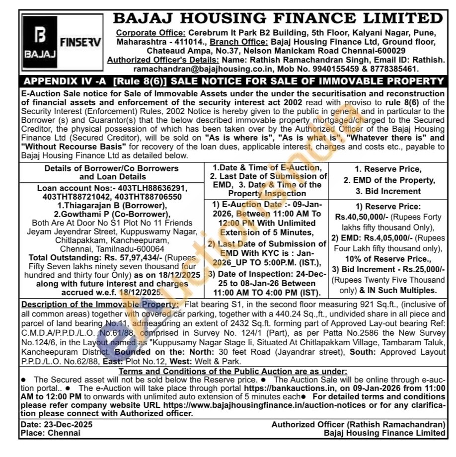 Description of the Immovable Property: Flat bearing S1, in the second floor measuring 921 Sq.ft., (inclusive of all common areas) together with covered car parking, together with a 440.24 Sq.,ft., undivided share in all piece and parcel of land bearing No.11, admeasuring an extent of 2432 Sq.ft. forming part of Approved Lay-out bearing Ref: C.M.D.A/P.P.D./L.O. No.61/88, comprised in Survey No. 124/1 (Part), as per Patta No.2586 the New Survey No.124/6, in the Layout named as "Kuppusamy Nagar Stage li, Situated At Chitlapakkam Village, Tambaram Taluk, Kancheepuram District. Bounded on the: North: 30 feet Road (Jayandrar street), South: Approved Layout P.P.D./L.O. No.62/88, East: Plot No. 12, West: Welt & Park.