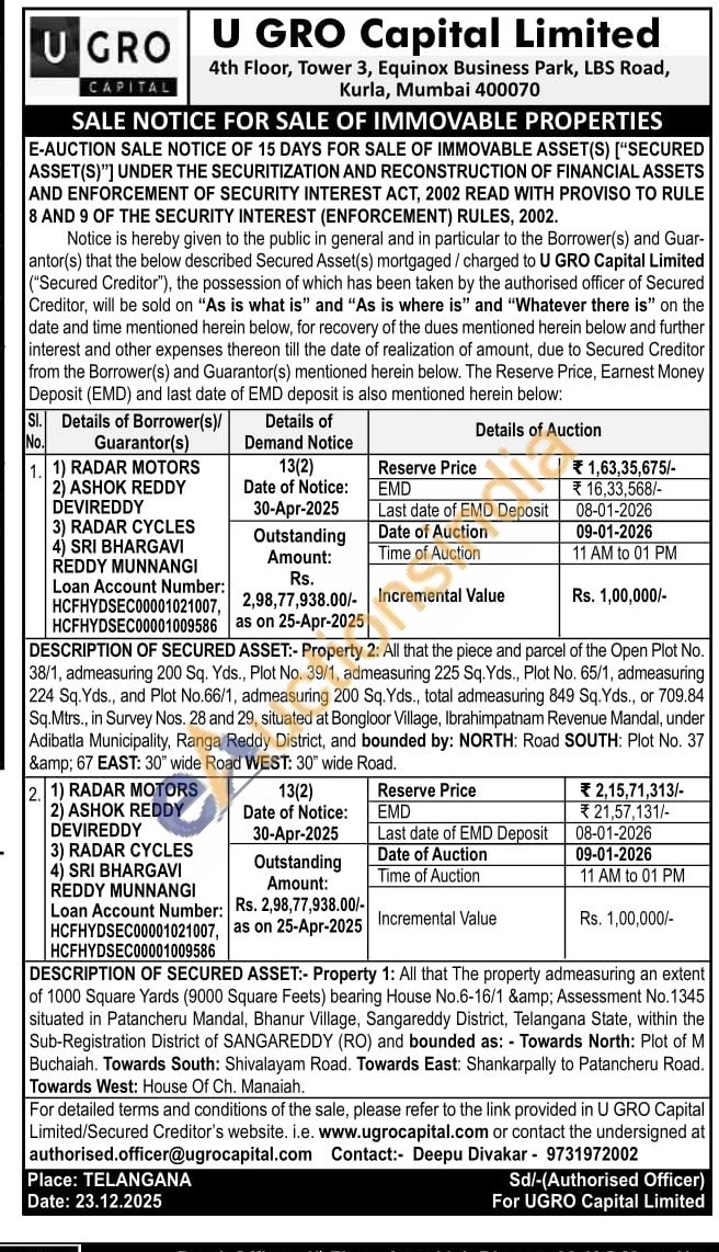 All that the piece and parcel of the Open Plot No. 38/1, admeasuring 200 Sq. Yds., Plot No. 39/1, admeasuring 225 Sq. Yds., Plot No. 65/1, admeasuring 224 Sq. Yds., and Plot No.66/1, admeasuring 200 Sq. Yds., total admeasuring 849 Sq. Yds., or 709.84 Sq.Mtrs., in Survey Nos. 28 and 29, situated at Bongloor Village, Ibrahimpatnam Revenue Mandal, under Adibatla Municipality, Ranga Reddy District, and bounded by: NORTH: Road SOUTH: Plot No. 37 & 67 EAST: 30" wide Road WEST: 30" wide Road.