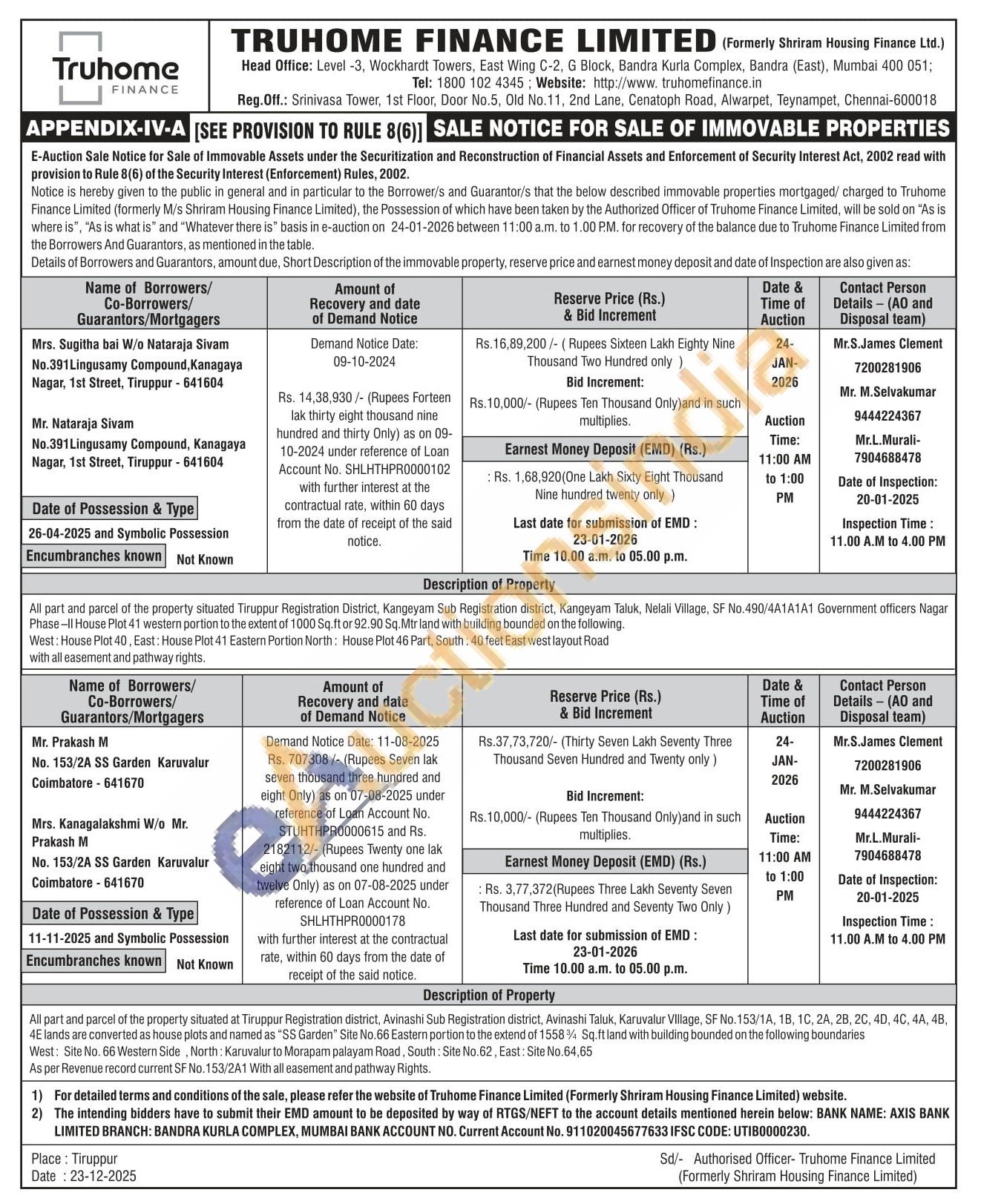 All part and parcel of the property situated at Tiruppur Registration district, Avinashi Sub Registration district, Avinashi Taluk, Karuvalur Village, SF No. 153/1A, 1B, 1C, 2A, 2B, 20, 40, 40, 4A, 4B. 4E lands are converted as house plots and named as "SS Garden" Site No.66 Eastern portion to the extend of 1558% Sq.ft land with building bounded on the following boundaries West: Site No. 66 Western Side North: Karuvalur to Morapam palayam Road, South: Site No.62, East: Site No.64,65 As per Revenue record current SF No. 153/2A1 With all easement and pathway Rights.