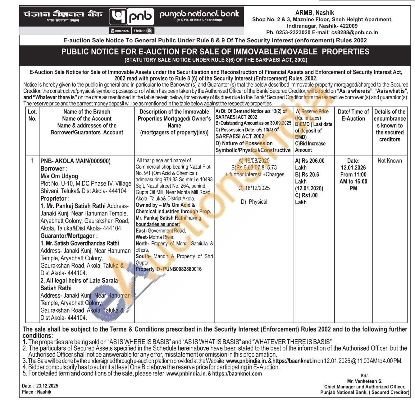 All that piece and parcel of Commercial shop bearing Nazul Plot No. 9/1 (Om Acid & Chemical) 2. All legal heirs of Late Sarala Satish Rathi Address- Janaki Kunj, Near Hanuman Temple, Aryabhatt Colony, Gaurakshan Road, Akola, Taluka & Dist Akola