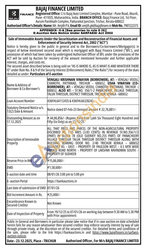 ALL THAT PIECE AND PARCEL OF THE NON-AGRICULTURAL PROPERTY DISCRIBED AS: 1.55 ARES (3.83 CENTS) IN REVENUE SY.NO.356/1/2 (PART) IN BLOCK 78 (OLD SUERVEY NO.255 PART) OF PANACHEERY VILLAGE THRISSUR TALUK THRISSUR DISTRICT THRISSUR ALONG WITH BUILDING BEARING DOOR NO. 2/40 TRICHUR KERALA 680652 BOUNDED AS: EAST: PROPERTY OF PAULSON WEST: 4.5 MTR WIDE PRIVATE ROAD NORTH: PROPERTY OF LAKSHMI RAVINDRAN SOUTH: PROPERTY OF SUDHEER