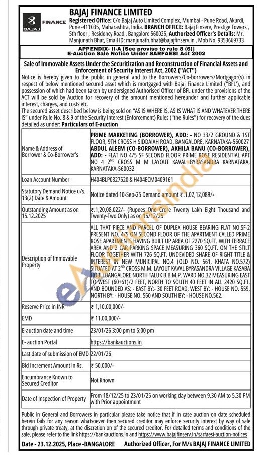 ALL THAT PIECE AND PARCEL OF DUPLEX HOUSE BEARING FLAT NO.SF-2 PRESENT NO. 4/5 ON SECOND FLOOR OF THE APARTMENT CALLED PRIME ROSE APARTMENTS HAVING BUILT UP AREA OF 2270 SQ.FT. WITH TERRACE AREA AND 2 CAR PARKING SPACE MEASURING 360 SQ.FT. ON THE STILT FLOOR TOGETHER WITH 726 SQ.FT. UNDEVIDED SHARE OF RIGHT TITLE & INTEREST IN NEW MUNICIPAL NO.4 (OLD NO. 561, KHATA NO.572) SITUATED AT 2ND CROSS M.M. LAYOUT KAVAL BYRASANDRA VILLAGE KASABA HOBLI BANGALORE NORTH TALUK B.B.M.P. WARD NO.32 MEASURING EAST TO WEST (60+61)/2 FEET, NORTH TO SOUTH 40 FEET IN ALL 2420 SQ.FT. AND BOUNDED AS: - EAST BY:-30 FEET ROAD, WEST BY: HOUSE NO. 559, NORTH BY:-HOUSE NO. 560 AND SOUTH BY: -HOUSE NO.562