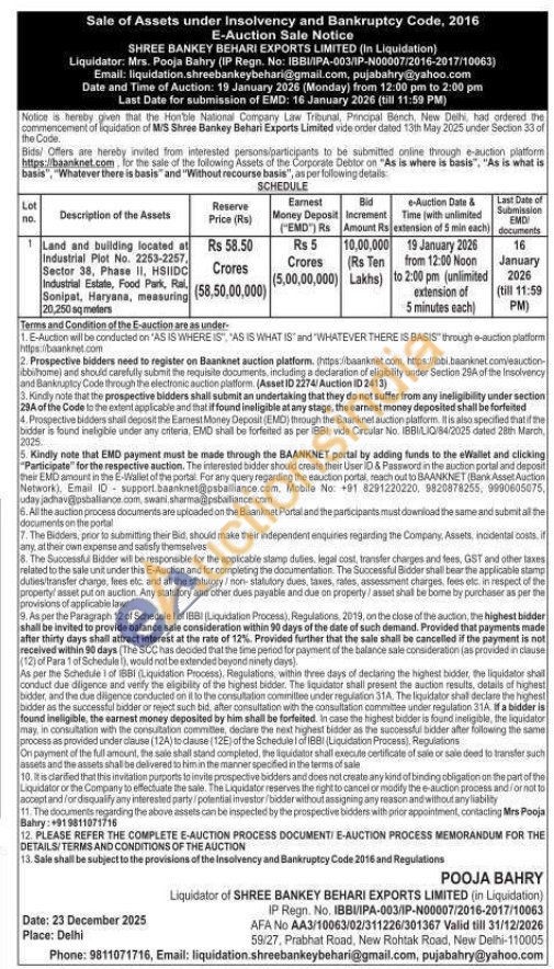 Land and building located at Industrial Plot No. 2253-2257, Sector 38, Phase II, HSIIDC Industrial Estate, Food Park, Rai, Sonipat, Haryana, measuring 20,250 sq mtr