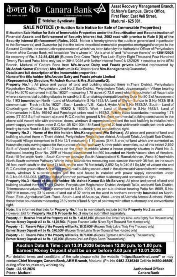 All piece and parcel of land and building situated there in, Theni District, Periyakulam Registration District, Periyakulam Joint No.2 Sub-District, Periyakulam Taluk, Jayamangalam Village bearing Patta No.6070 comprised in S.No. 1632/1 measuring 1.78 acres (0.72.0 ares) which is equivalent of Vacant site where a commercial building situates in wardNo.8, Erumalainayakanpatti bearing Door No.80-2 of Assessment No. 1163 bounded on North-Land of Mookkaiah in S.No 1633/1A, land of Shyam Sundar in S.No 1633/18 & common cart-Track in S.No 1632/1, East-Lands of V.E. Kaja & Hyder Ali in S.No 1633/2A, South-Land of Chokkalingam Chettiar in S.Nos 1632/2 & 1632/3, West Land of Manuvel in S.No 1653/1, Land of Chinnamadan in S.No 1654/2 and Panchayat union road in 1653/2. Within these boundaries measuring 1.78 acres (77,608 Sq.ft) of vacant site and R.C.C roofed ground & first floor commercial building constructed in the above said vacant site with entrance, doors, windows & superstructures and the said building is installed with power supply connection under S.C.No.05-524-004-1845 and right of 20 feet width north-south cart-track which leading to main Road in S.No 1633/2A with other customary and conventional right.
