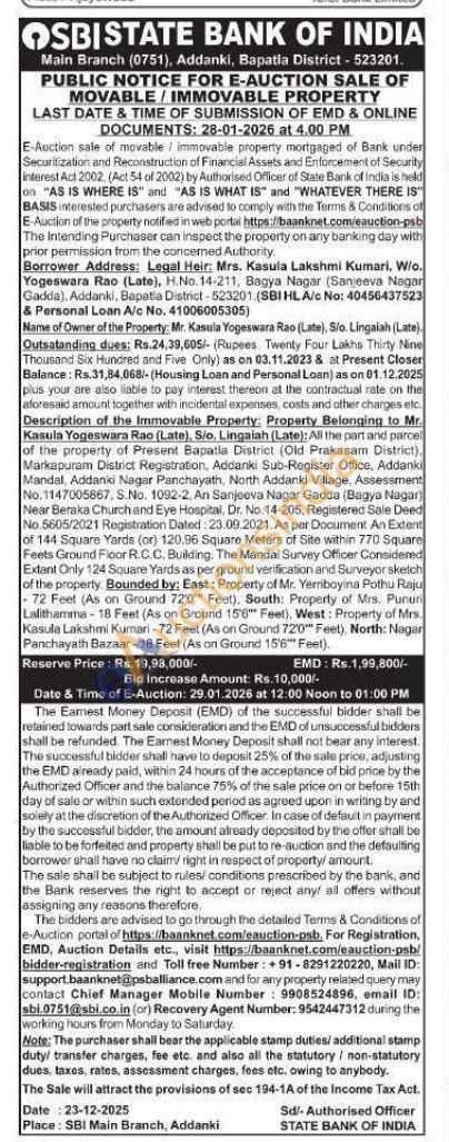 All the part and parcel of the property of Present Bapatla District (Old Prakasam District). Markapuram District Registration, Addanki Sub-Register Office, Addanki Mandal, Addanki Nagar Panchayath, North Addanki Village, Assessment No. 1147005867, S.No. 1092-2, An Sanjeeva Nagar Gadda (Bagya Nagar) Near Beraka Church and Eye Hospital, Dr. No. 14-205, Registered Sale Deed No.5605/2021 Registration Dated: 23.09.2021. As per Document An Extent of 144 Square Yards (or) 120.96 Square Meters of Site within 770 Square Feets Ground Floor R.C.C. Building.