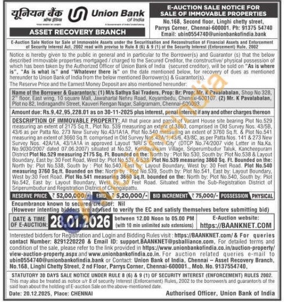 DESCRIPTION OF IMMOVABLE PROPERTY: All that piece and parcel of Vacant House site bearing Plot No.529 measuring an extent of 2175 Sq.ft.. Plot No. 539 measuring an extent of 3860, comprised in Old Survey Nos. 43/58, 43/6 as per Patta No. 273 New Survey No. 43/1A1A. Plot No 540 measuring an extent of 3760 Sq.ft. & Plot No.541 measuring an extent of 3660 Sq.ft. comprised in Old Survey Nos. 42A/1, 43/6, 43/BC, as per Patta Nos. 141 & 273 New Survey Nos. 42A/1A, 43/1A1A in approved Layout "NRI'S Centre City" (DTCP No.74/2007 vide Letter in Na Ka. No. 9030/2007 dated 07.06.2007) situated at No.52, Kondavakkam Village, Sriperumbudur Taluk, Kancheepuram District Plot No.529 measuring 2175 Sq. Ft. Bounded on the: North by: Plot No 530, South by: Plot No.538 & Layout Boundary, East by: 30 Feet Road, West by: Plot No.537 & 538. Plot No.539 measuring 3860 Sq. Ft. Bounded on the: North by: Plot No.538, South by Plot No.540, East by: Layout Boundary, West by: 30 Feet Road. Plot No.540 measuring 3760 Sq.ft. Bounded on the: North by Plot No 539, South by: Plot No.541, East by: Layout Boundary, West by:30 Feet Road. Plot No.541 measuring 3660 Sq.ft. bounded on the: North by: Plot No.540, South by: Plot No.542, East by: Layout Boundary, West by: 30 Feet Road. Situated within the Sub-Registration District of Sriperumbudur and Registration District of Chengalpattu