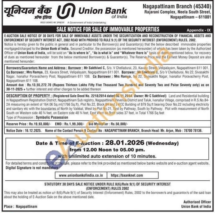 DESCRIPTION OF PROPERTY: (Registered Sale Deed No. 2218/2014 dated 06.11.2014. Owner: Mr C Sakthivel) Land and Residential building in Nagapattinam Registration District, Nagapattinam Sub registry, Nagapattinam Revenue District and Taluk, Ivanallur Village, comprised in R.S.No.84-2A measuring an extent of 164.06 Sq.mt(1766 Sq.ft), Plot No.22, Block 8A and a RCC Building of 879 Sq.ft bearing Door No.22 including electricity and sanitary etc with the boundaries of North by Vaikkal, West by Plot No.21, East by Pathway, South by Pathway. Plot with measurement of North South on Western side 46 3/4 feet, on Eastern side 48% feet. East West on Both sides 37 feet, in Total 1766 Sq.feet