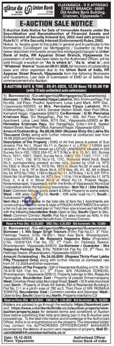 EM of Residential Building in D.N. 26-12-76-8//9-12A Flat No. C1, 3 Floor, SRI PADMAJA TOWERS, Bhavanipuram, Vijayawada-520012. Property belongs to Mrs. Rajaputra Padmajabai. Boundaries: East: Property of pisipati Srimannarayana; West: Crombay Road alias Municipal Road; South: 30 ft wide municipal road, North: Property of Shaik Alli Saheb. EM of Residential Building in Flat No. C-1 in a plinth area of 782 sq.ft, Third Floor of SRI PADMAJA TOWERS. Boundaries: East: Common corridor and Staircase; West: Open to Sky: South: Open to sky; North: Property vide flat no C3