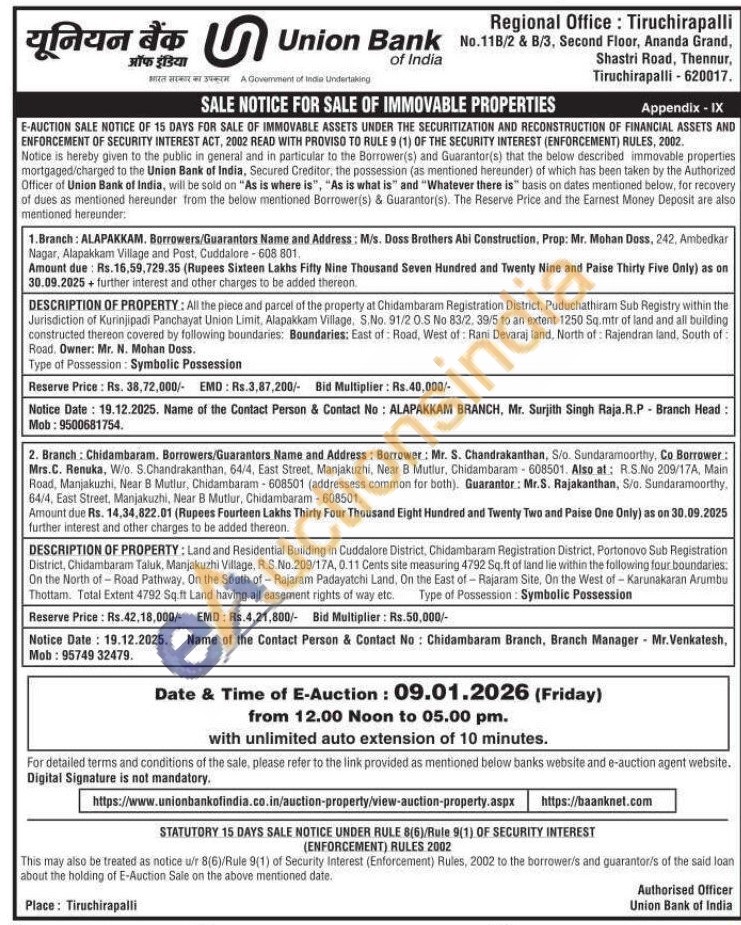 DESCRIPTION OF PROPERTY: Land and Residential Building in Cuddalore District, Chidambaram Registration District, Portonovo Sub Registration District, Chidambaram Taluk, Manjakuzhi Village, R. S.No.209/17A, 0.11 Cents site measuring 4792 Sq.ft of land lie within the following four boundaries: On the North of-Road Pathway. On the South of Rajaram Padayatchi Land, On the East of Rajaram Site. On the West of Karunakaran Arumbu Thottam. Total Extent 4792 Sq.ft Land having all easement rights of way etc