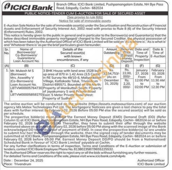 3 BHK House with land area 1528 built up area of 870 in 1.42 Ares (3.5 Cents) in RE Survey No 49/10-6, Maliyankeezh Village, Kattakada Taluk, Trivandrum District 695571, Bounded on the North: Property of Manikuttan South: Property of Jayakumary S and Private Road East: 5 Meter Private Road West: Property of Sudhev
