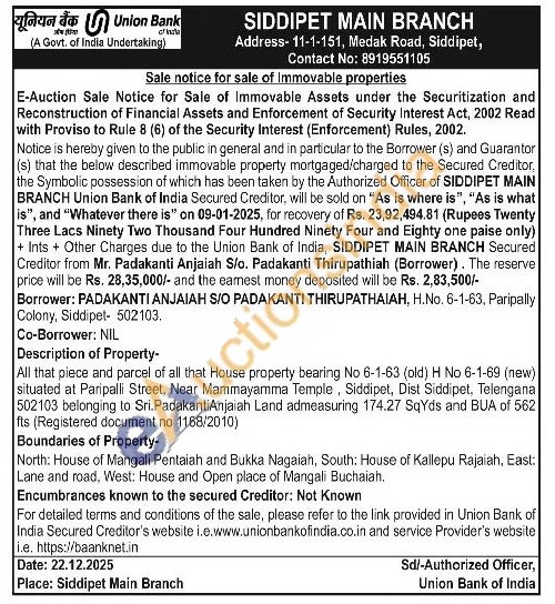 All that piece and parcel of all that House property bearing No 6-1-63 (old) H No 6-1-69 (new) situated at Paripalli Street, Near Mammayamma Temple, Siddipet, Dist Siddipet, Telengana 502103 belonging to Sri. PadakantiAnjaiah Land admeasuring 174.27 SqYds and BUA of 562 fts (Registered document no 1168/2010) Boundaries of Property- North: House of Mangali Pentaiah and Bukka Nagaiah, South: House of Kallepu Rajaiah, East: Lane and road, West: House and Open place of Mangali Buchaiah