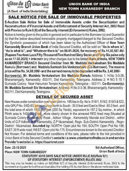 New House under construction over open plot no. 195 lies in Sy. No's: 519/1, 519/2, 519/3 & 522, vide GPLP No. 5/82-83, admeasuring North to South: 30.0 feet and East to West: 60.0 feet, and the total area of which 1800 Sq Feet (200 Sq Yards), equivalent to 167.2 Sq metres, in which Plinth area is 1400 Sq. Feet, more clearly shown in the annexed RED lined map. Situated at Gumasta Colony Ramareddy Road, Adloor Village, Kamareddy Mandal and District, within limits of G.P Adloor, M.P Kamareddy, Z.P Nizamabad, Regn. Sub-District Kamareddy, Regn-District: Nizamabad. Bounded by: NORTH: Open plot No 194; SOUTH: Open Plot No 196; EAST: 30 ft wide road: WEST: Open plot No 175. Encumbrances known to the secured Creditor: Not Known; For detailed terms and conditions of the sale, please refer to the link provided in Union Bank of India Secured Creditor's website i.e.www.unionbankofindia.co.in and service Provider's website i.e. https://baanknet.com