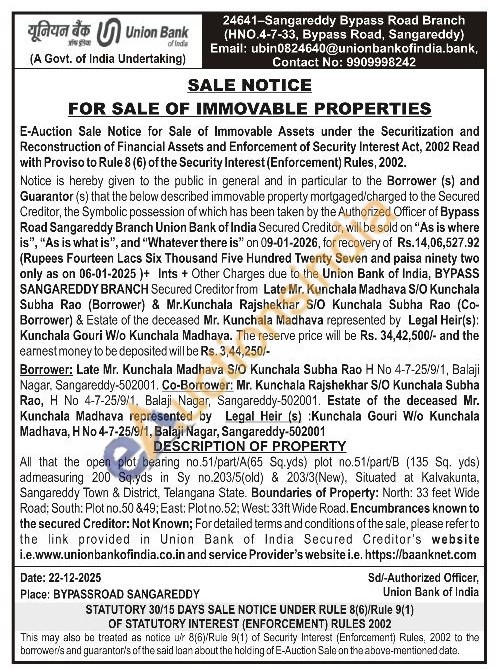 All that the open plot bearing no.51/part/A(65 Sq.yds) plot no.51/part/B (135 Sq. yds) admeasuring 200 Sq.yds in Sy no.203/5(old) & 203/3(New), Situated at Kalvakunta, Sangareddy Town & District, Telangana State. Boundaries of Property: North: 33 feet Wide Road: South: Plot no.50 &49; East: Plot no.52; West: 33ft Wide Road. Encumbrances known to the secured Creditor: Not Known; For detailed terms and conditions of the sale, please refer to the link provided in Union Bank of India Secured Creditor's website i.e.www.unionbankofindia.co.in and service Provider's website i.e. https://baanknet.com