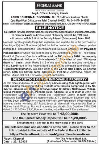 All that piece and parcel of landed property admeasuring 2542 sqft together with RCC building measuring 384 sq ft plinth area thereon comprised in Sy No. 325/18 situated at Plot No.2, Iswarya Nagar 1st Street, Neithavoyal Village, Minjur Panchayat Union, Ponneri Taluk, Chengai MGR District within the Registration Sub District of Ponneri and Registration District of North Madras measuring East to West on the Northern side: 39 ft 9 inches, on Southern side: 40 ft. North to South on the Eastern side: 61 ft 9 inches, on Western side: 65 ft 9 inches and bounded on the North by: 23 ft Road, South by: Meenakshi Nagar lay out, East by: Plot No.1 and West by: Plot No.3 morefully described in Sale Deed No. 7578/2008 dated 31.10.2008 of SRO, Ponneri standing in the Name of P Ramya Kuman