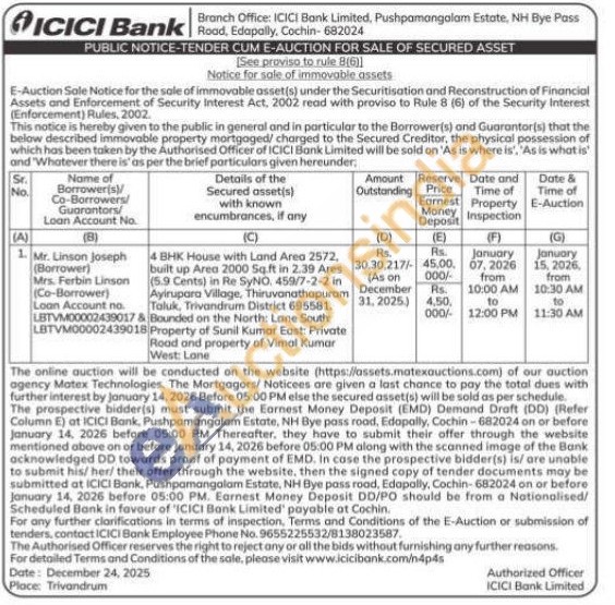 4 BHK House with Land Area 2572, built up Area 2000 Sqft in 2.39 Ares (5.9 Cents) in Re SyNO. 459/7-2-2 in Ayirupara Village, Thiruvanathapuram Taluk, Trivandrum District 695581. Bounded on the North: Lone South Property of Sunil Kumar East: Private Road and property of Vimal Kumar West: Lone