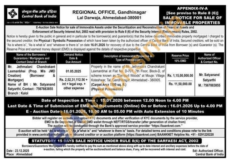 Property in the name of Mr. Jethmalani Chandrakant Laxmanbhai at Flat No. D-701, 7th Floor, Block-D, of scheme known as "Sampad Woods" at Mouje: Village Koteshwar, Tal. Gandhinagar, Ahmedabad - 380005. (Carpet Area 1180 sq. ft.)
