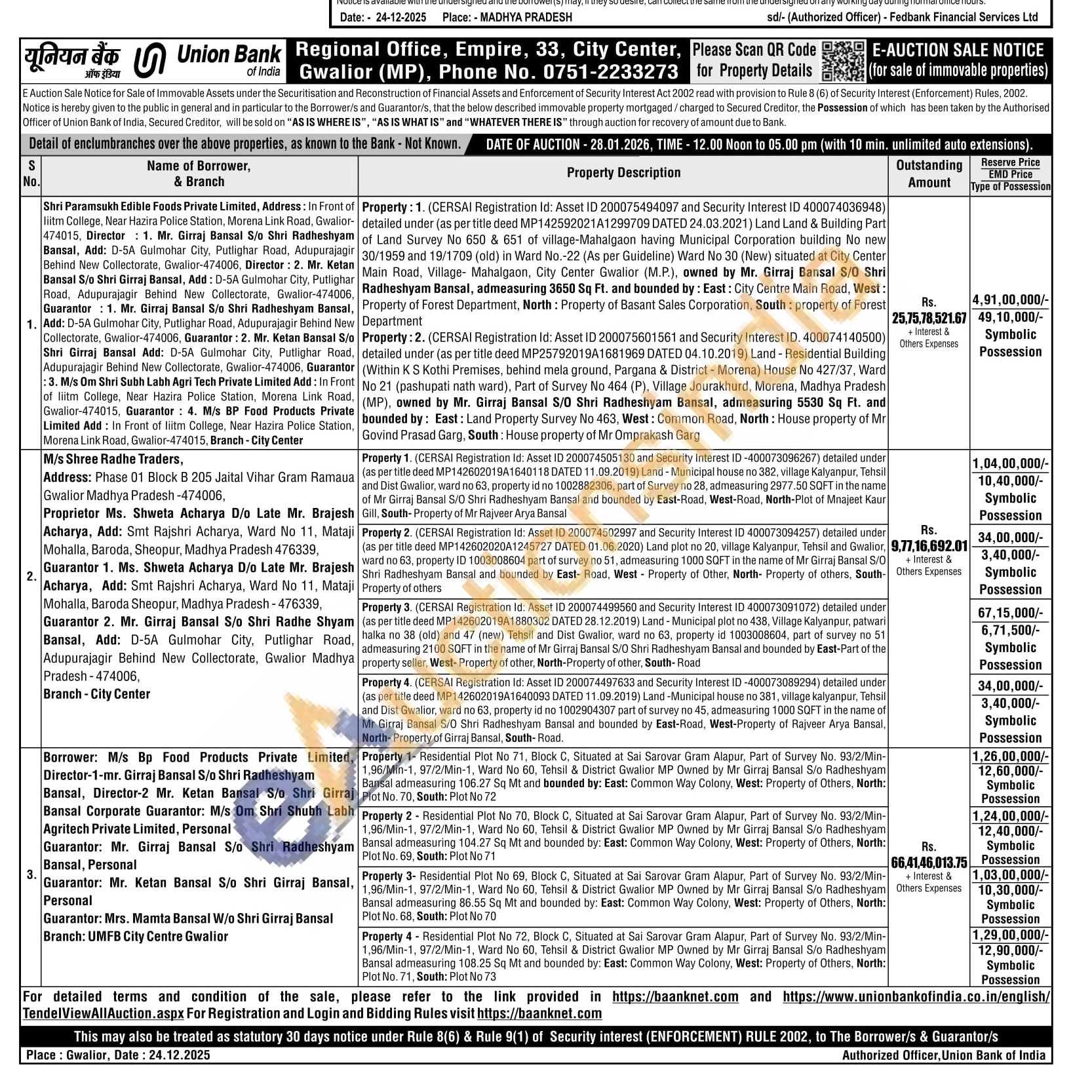 Property 4. (CERSAI Registration Id: Asset ID 200074497633 and Security Interest ID-400073089294) detailed under (as per title deed MP142602019A1640093 DATED 11.09.2019) Land-Municipal house no 381, village kalyanpur, Tehsil and Dist Gwalior, ward no 63, property id no 1002904307 part of survey no 45, admeasuring 1000 SQFT in the name of Mr Girraj Bansal S/O Shri Radheshyam Bansal and bounded by East-Road, West-Property of Rajveer Arya Bansal, North-Property of Girraj Bansal, South-Road.