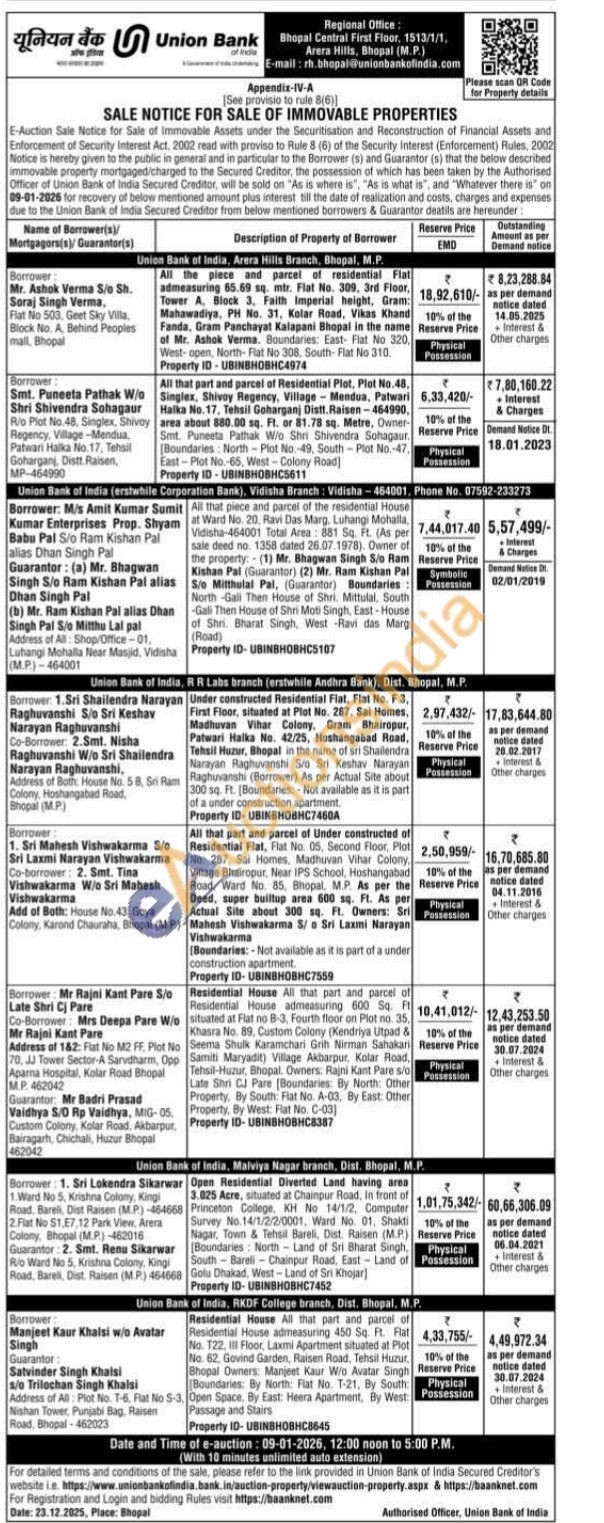 Under constructed Residential Flat, Flat No. F3, First Floor, situated at Plot No. 287, Sai Homes. Madhuvan Vihar Colony, Gram Shairopur, Patwari Halka No. 42/25, Hoshangabad Road, Tehsil Huzur, Bhopal in the name of sri Shailendra Narayan Raghuvanshi Sto Sri Keshav Narayan Raghuvanshi (Borrower) As per Actual Site about 300 sq. Ft. [Boundaries: - Not available as it is part of a under construction apartment.