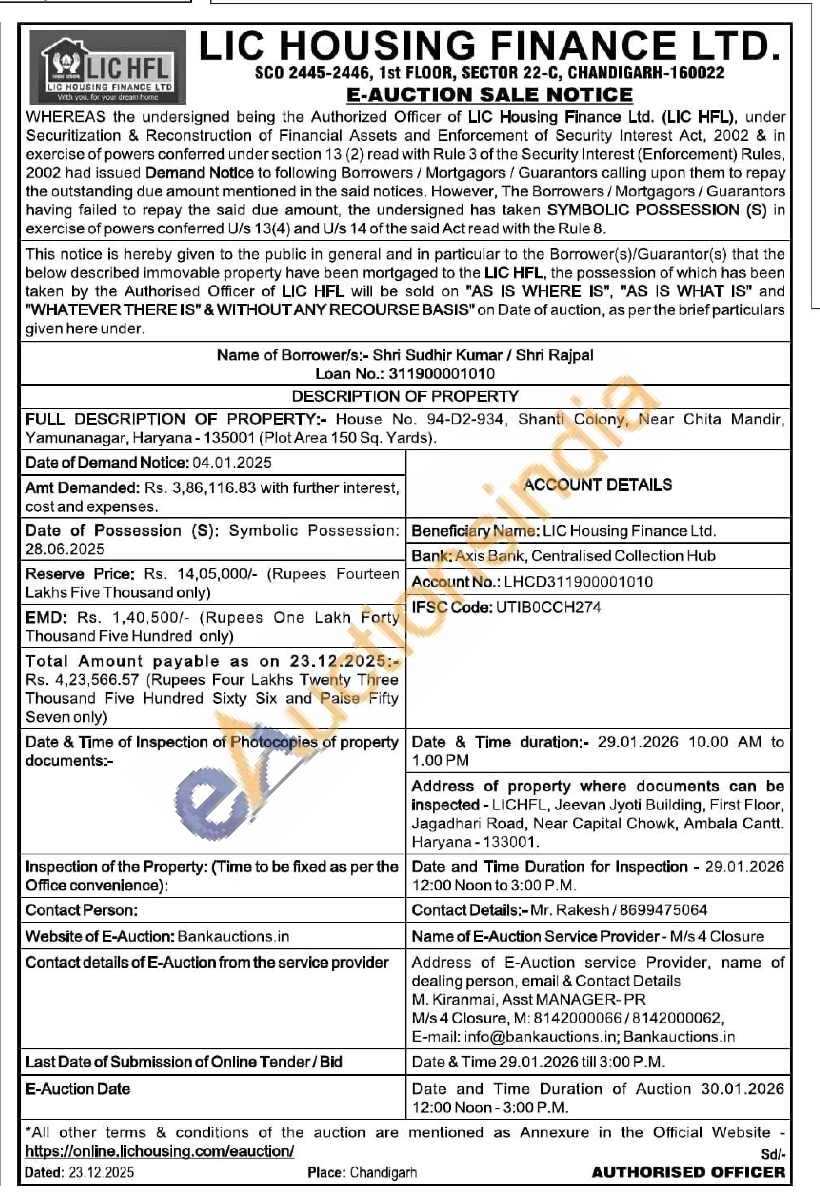 FULL DESCRIPTION OF PROPERTY:- House No. 94-D2-934, Shanti Colony, Near Chita Mandir, Yamunanagar, Haryana-135001 (Plot Area 150 Sq. Yards).