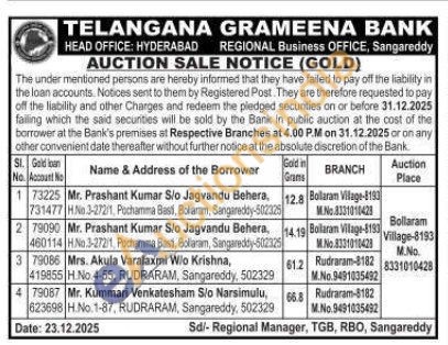 Telangana Grameena Bank Gold Auctions Auction in Sangareddy