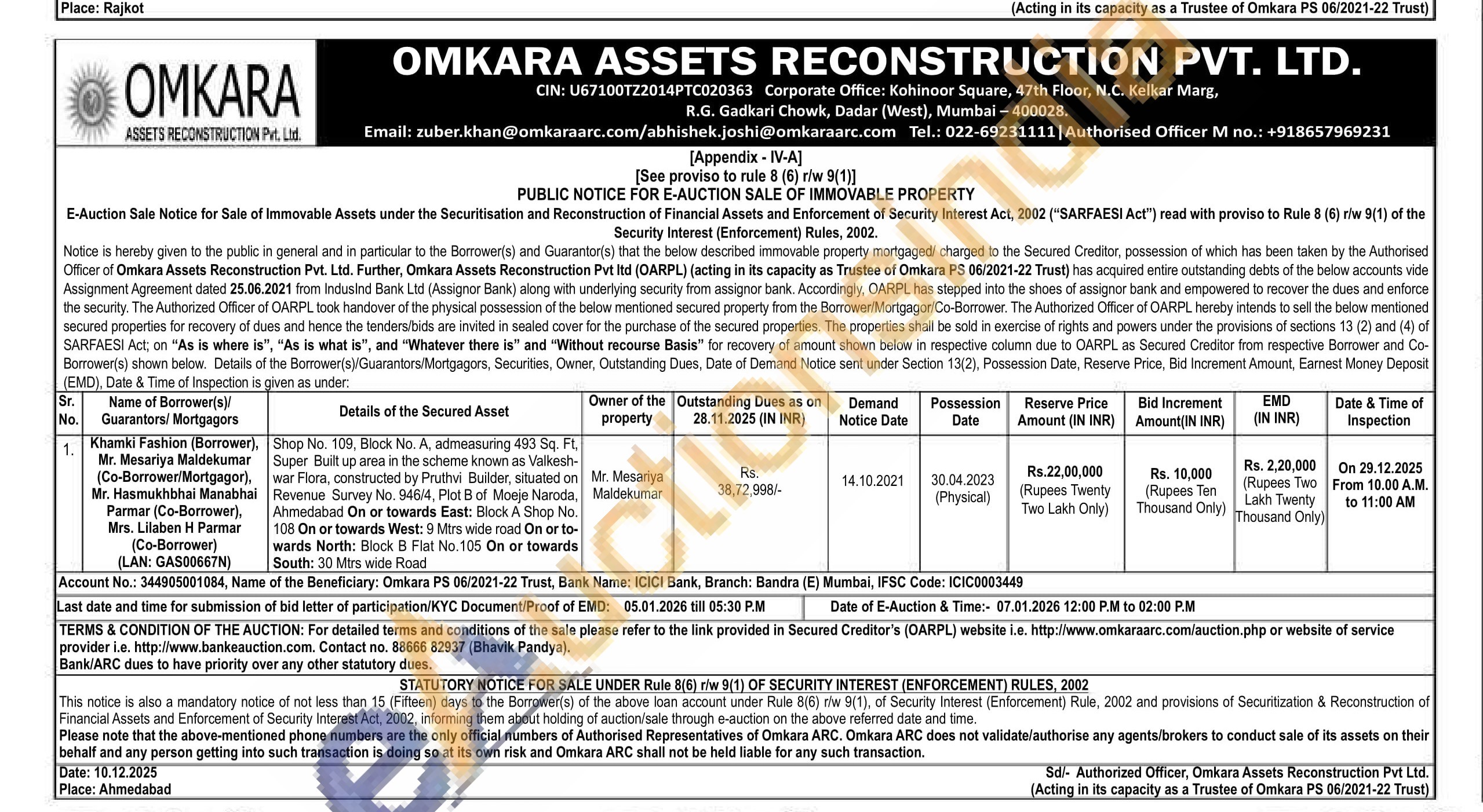 Shop No. 109, Block No. A, admeasuring 493 Sq. Ft. Super Built up area in the scheme known as Valkesh-war Flora, constructed by Pruthvi Builder, situated on Revenue Survey No. 946/4, Plot B of Moeje Naroda, Ahmedabad On or towards East: Block A Shop No. 108 On or towards West: 9 Mtrs wide road On or to-wards North: Block B Flat No. 105 On or towards South: 30 Mtrs wide Road.