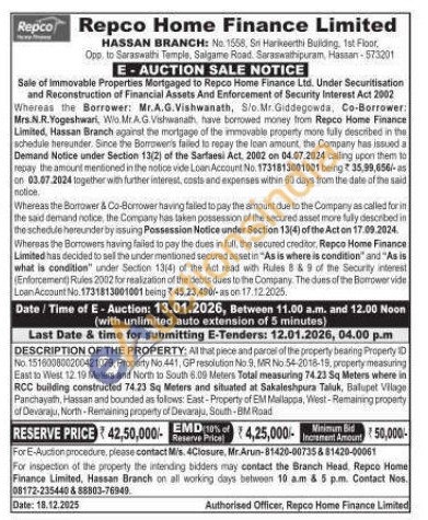 DESCRIPTION OF THE PROPERTY: All that piece and parcel of the property bearing Property D No. 151000800200421079, Property No 441, GP resolution No.9, MR No.54-2018-19, property measuring East to West 12.19 Meters and North to South 6.00 Meters Total measuring 74.23 Sq Meters where in RCC building constructed 74.23 Sq Meters and situated at Sakaleshpura Taluk, Balupet Vilage Panchayath, Hassan and bounded as follows: East-Property of EM Mallappa, West-Remaining property of Devaraju, North-Remaining property of Devaraju, South-BM Road