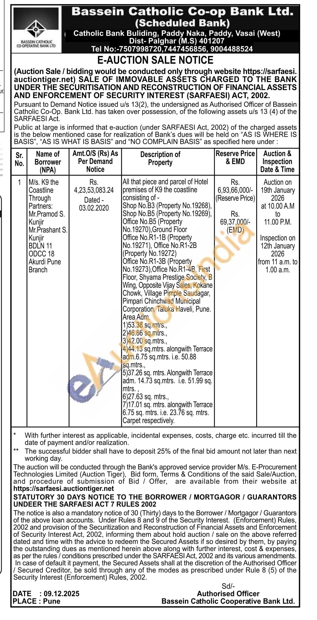 All that piece and parcel of Hotel premises of K9 the coastline consisting of -Shop No.B3 (Property No. 19268),Shop No.B5 (Property No. 19269), Office No.B5 (Property No. 19270), Ground Floor Office No.R1-1B (Property No. 19271), Office No.R1-2B Property No. 19272) Office No.R1-3B (Property No. 19273). Office No.R1-4B, First Floor, Shyama Prestige Society, B Wing, Opposite Vijay Sales, Kokane Chowk, Village Pimple Saudagar, Pimpari Chinchwad Municipal Corporation, Taluka Haveli, Pune. Area Adm. 1)53.38 sq.mtrs., 2)46.86 sq.mtrs.. 3)42.00 sq.mtrs.,4)44.13 sq.mtrs. alongwith Terrace adm.6.75 sq.mtrs. i.e. 50.88 sq.mtrs.. 5)37.26 sq. mtrs. Alongwith Terrace adm. 14.73 sq.mtrs. i.e. 51.99 sq. mtrs. 6)27.63 sq. mtrs., 7)17.01 sq. mtrs. alongwith Terrace 6.75 sq. mtrs. i.e. 23.76 sq. mtrs. Carpet respectively.