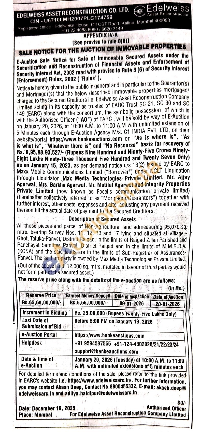 All those pieces and parcel of Non-Agricultural land admeasuring 95,070 sq. mtrs. bearing Survey Nos. 11, 12, 13 and 17 lying and situated at Village -Ghot, Taluka-Panvel, District Raigad, in the limits of Raigad Zillah Parishad and Panchayat Samittee Panvel, District-Raigad and in the limits of M.M.R.D.A. (KCNA) and the said lands are in the limits of Sub-Registrar of Assurances-Panvel. The said property is owned by Max Media Technologies Private Limited. (Out of the above land, 12,000 sq. mtrs. mutated in favour of third parties would not form part of the secured asset.)