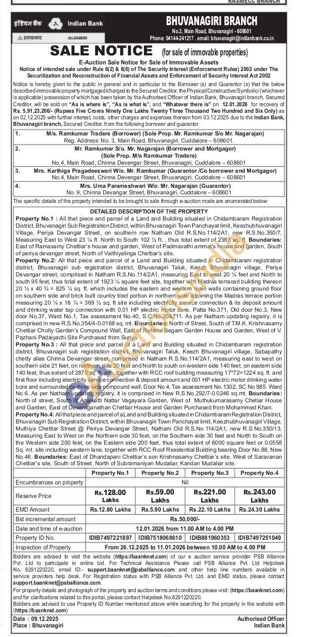 Property No.4: All thatpiece and parcel of aLand and Building situated in Chidambaram Registration District, Bhuvanagiri Sub Registration District, within Bhuvanagin Town Panchayat limit, Keezhubhuvanagiri Village, Muthiya Chettiar Street @ Periya Devangar Street, Natham Old R.S.No. 114/2A1, new R.S. No.350/13, Measuring East to West on the Northern side 30 feet, on the Southern side 30 feet and North to South on. the Western side 200 feet, on the Eastern side 200 feet, thus total extent of 6000 square feet or 0.0558 Sq. mt. site including western lane, together with RCC Roof Residential Building bearing Door No.88, New No.46. Boundaries: East of Dhandapani Chettiar's son Krishnasamy Chettiar's site. West of Saravanan Chettiar's site, South of Street, North of Subramaniyan Mudaliar, Kandan Mudaliar site