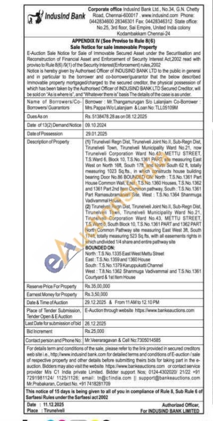1) Tirunelveli Regn Dist, Tirunelvell Joint No. II, Sub-Regn Dist, Tirunelveli Town, Tirunelveli Municipality Ward No.21, now Tirunelveli Corporation Ward No.43, METTU STREET, T.S.Ward 6, Block 10, T.S.No. 1361 PART, site measuring East West on North 16ft, Soum 17ft, and North South 62 ft, totally measuring 1023 Sq.fts, in which constructs house building bearing Door No 86 BOUNDED ON: North: TS.No. 1361 Part House Common Wall, East: TS.No. 1360 Houses, TS.No. 1362 and 1361 Part 2nd Hem Common pathway, South: T.S.No. 1361 Part Ramasubramanian Site, West: TS. No 1364 Shanmuga Vadivammal Housе. (2) Tirunelvell Regn Dist. Tirunelvell Joint No.Il, Sub-Regn Dist Tirunelveli Town, Tirunelveli Municipality Ward No.21, Tirunelveli Corporation Ward No.43, METTU STREET, T.S. Ward 16, South Block 10, T.S.No. 1361 PART and 1362 PART North Common Pathway site measuring East West 3t, South 174ft, totally measuring 523 Sqfts, with all easements rights in which undivided 1/4 share and entire pathway she BOUNDED ON: North: T.S.No.1335 East West Mettu Street East: TS.No. 1359 and 1360 House South TS No. 1379 Karuppukatti Channel West 7.8.No. 1362 Shanmuga Vadivammal and TS.No. 1361 Courtyard & 1st lem House