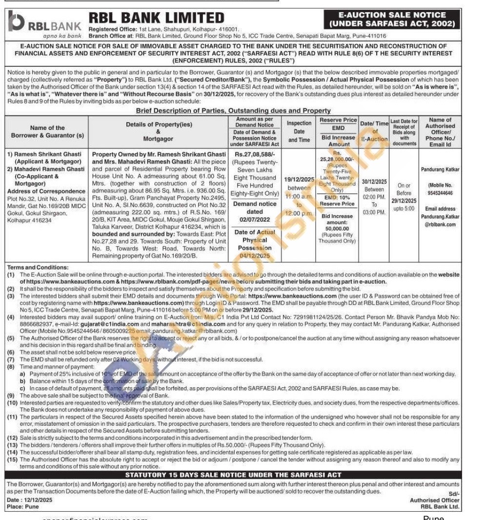 Property Owned by Mr. Ramesh Shrikant Ghasti and Mrs. Mahadevi Ramesh Ghasti: All the piece and parcel of Residential Property bearing Row House Unit No. A admeasuring about 61.00 Sq. Mtrs. (together with construction of 2 floors) admeasuring about 86.95 Sq. Mtrs. i.e. 936.00 Sq. Fts. Built-up), Gram Panchayat Property No.2495, Unit No. A, SI.No.6639, constructed on Plot No.32 (admeasuring 222.00 sq. mtrs.) of R.S.No. 169/20/B. KIT Area, MIDC Gokul, Mouje Gokul Shirgaon, Taluka Karveer, District Kolhapur 416234, which is bounded and surrounded by: Towards East: Plot No.27.28 and 29. Towards South: Property of Unit No. B, Towards West: Road, Towards North: Remaining property of Gat No. 169/20/B.