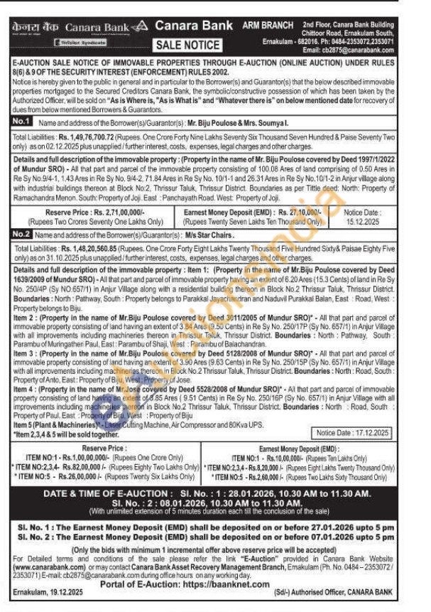 Details and full description of the immovable property: (Property in the name of Mr. Biju Poulose covered by Deed 1997/1/2022 of Mundur SRO) - All that part and parcel of the immovable property consisting of 100.08 Ares of land comprising of 0.50 Ares in Re Sy No.9/4-1, 1,43 Ares in Re Sy No. 9/4-2, 71.84 Ares in Re Sy No. 10/1-1 and 26.31 Ares in Re Sy No. 10/1-2 in Anjur village along with industrial buildings thereon at Block No:2, Thrissur Taluk, Thrissur District. Boundaries as per Tittle deed: North: Property of Ramachandra Menon. South: Property of Joji. East Panchayath Road. West: Property of Joji
