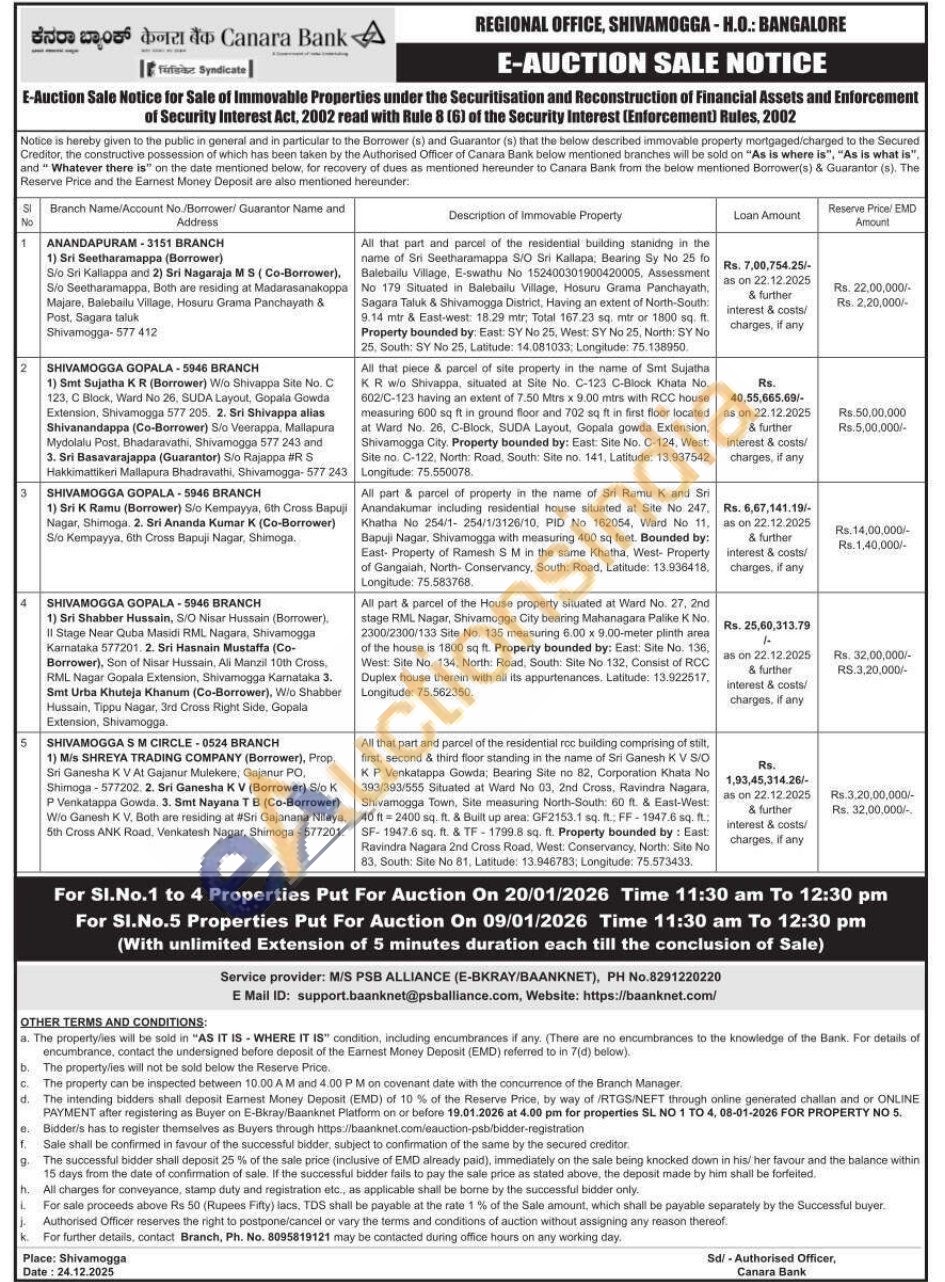 All that part and parcel of the residential roc building comprising of stilt, first, second & third floor standing in the name of Sri Ganesh K V S/O KP Venkatappa Gowda; Bearing Site no 82, Corporation Khata No 393/393/555 Situated at Ward No 03, 2nd Cross. Ravindra Nagara, Shivamogga Town, Site measuring North-South: 60 ft. & East-West: 40 ft=2400 sq. ft. & Built up area: GF2153.1 sq. ft: FF-1947.6 sq. ft.: SF-1947.6 sq. ft. & TF-1799.8 sq. ft. Property bounded by: East: Ravindra Nagara 2nd Cross Road, West: Conservancy, North: Site No 83. South: Site No 81, Latitude: 13.946783; Longitude: 75.573433.
