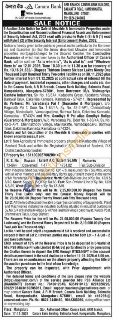 All the hypothecated movable properties consisting of Equipments, Plant and Machineries installed in industrial building situated in industrial building in Sy. No.5/4 at Hanehalli village & within Hanehalli village panchayat, Kuradi Post, Brahmavara Taluk, Udupi District
