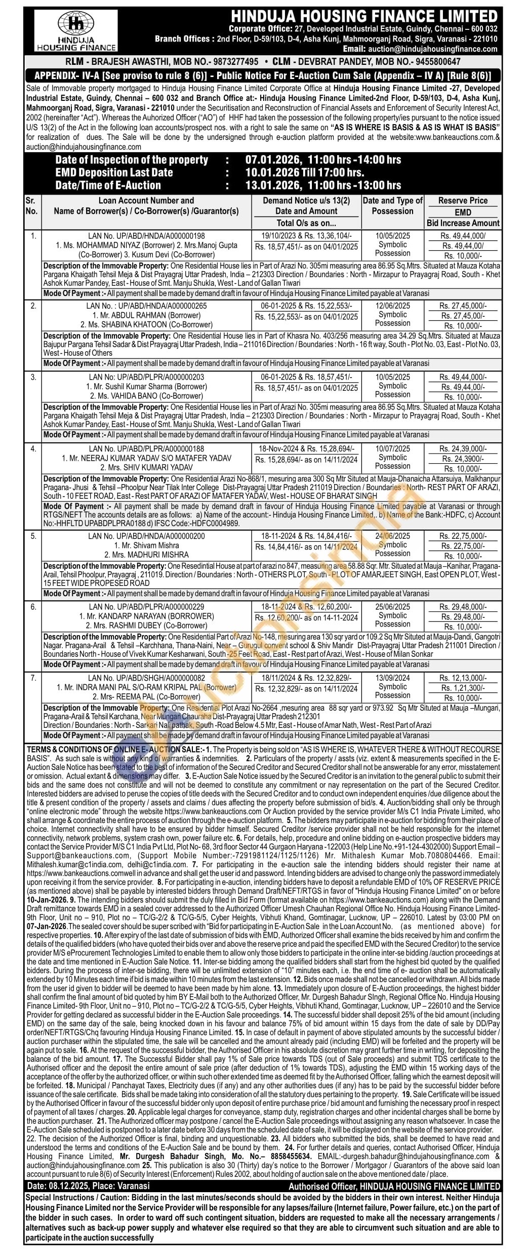 Description of the Immovable Property: One Residential House lies in Part of Arazi No. 305mi measuring area 86.95 Sq.Mtrs. Situated at Mauza Kotaha Pargana Khaigath Tehsil Meja & Dist Prayagraj Uttar Pradesh, India-212303 Direction/Boundaries: North - Mirzapur to Prayagraj Road, South - Khet Ashok Kumar Pandey, East - House of Smt. Manju Shukla, West-Land of Gallan Tiwari