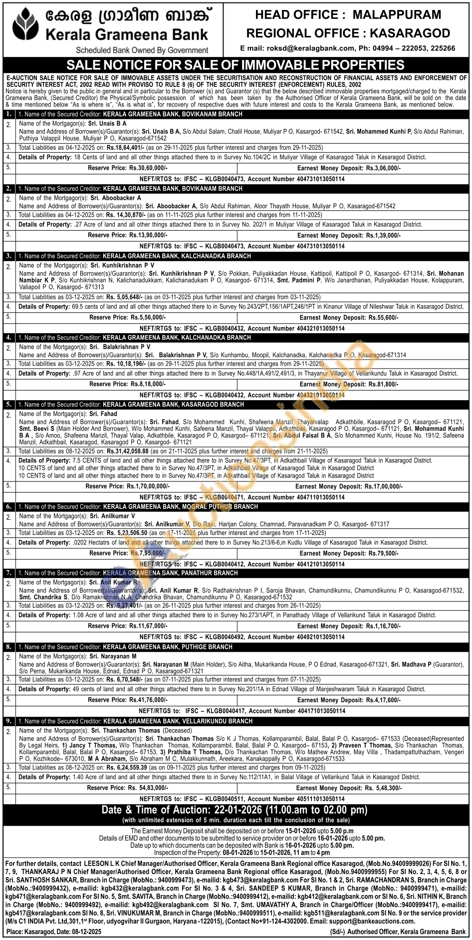 Details of Property: 27 Acre of land and all other things attached there to in Survey No. 202/1 in Muliyar Village of Kasaragod Taluk in Kasaragod District