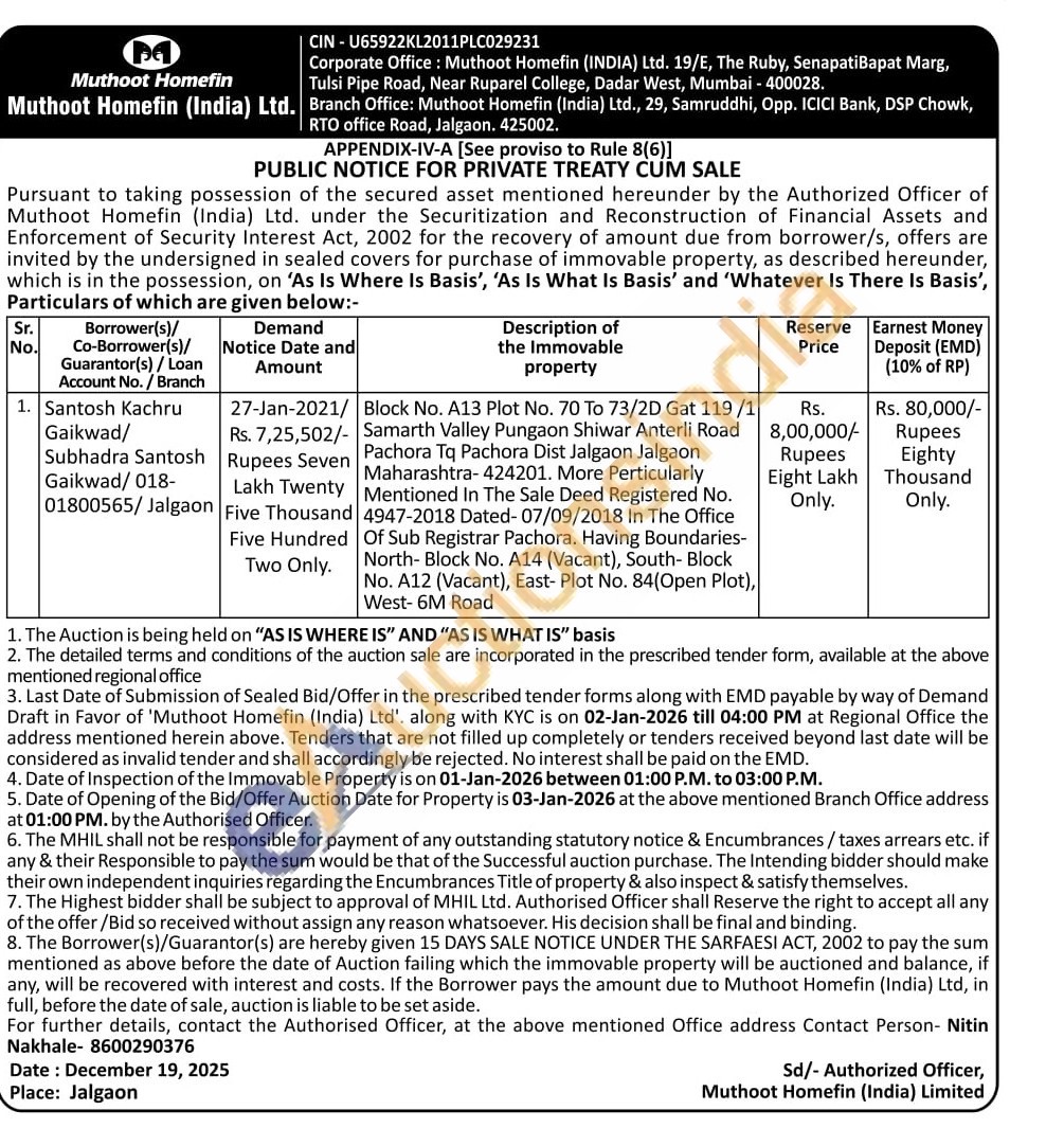 Block No. A13 Plot No. 70 To 73/2D Gat 119/1 Samarth Valley Pungaon Shiwar Anterli Road Pachora Tq Pachora Dist Jalgaon Jalgaon Maharashtra-424201. More Perticularly Mentioned In The Sale Deed Registered No. 4947-2018 Dated-07/09/2018 In The Office Of Sub Registrar Pachora. Having Boundaries-North- Block No. A14 (Vacant), South- Block No. A12 (Vacant), East- Plot No. 84(Open Plot), West-6M Road