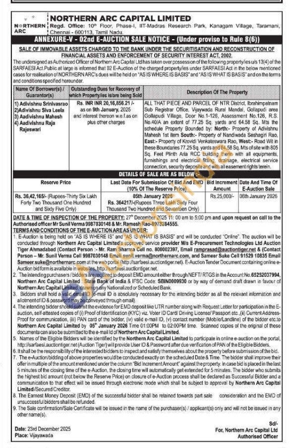ALL THAT PIECE AND PARCEL OF NTR District, Ibrahimpalnam Sub Registrar Office, Vijaywada Rural Mandal, Gollapudi area Gollapudi Villege, Door No. 1-126, Assessment No.126, R.S. No.40/A an extent of 77.25 Sq yards and 64.58 Sq. Mts the schedule Property Bounded by: North: Property of Adivishnu Mahesh 1st item South:- Property of Nandiwada Seshagiri Rao East:- Property of Krovidi Venkateswara Rao, West:- Road Wit in these Boundaries 77.25 Sq. yards and 64.58 Sq. Mts of sile with 805 Sq. Feet Plinth Aria RCC building therin with all equipments, furnishings and electrical fitting, drainage, electrical service connection, security deposite and with all easement rights lerein. DETAILS OF SALE ARE AS BELOW:-
