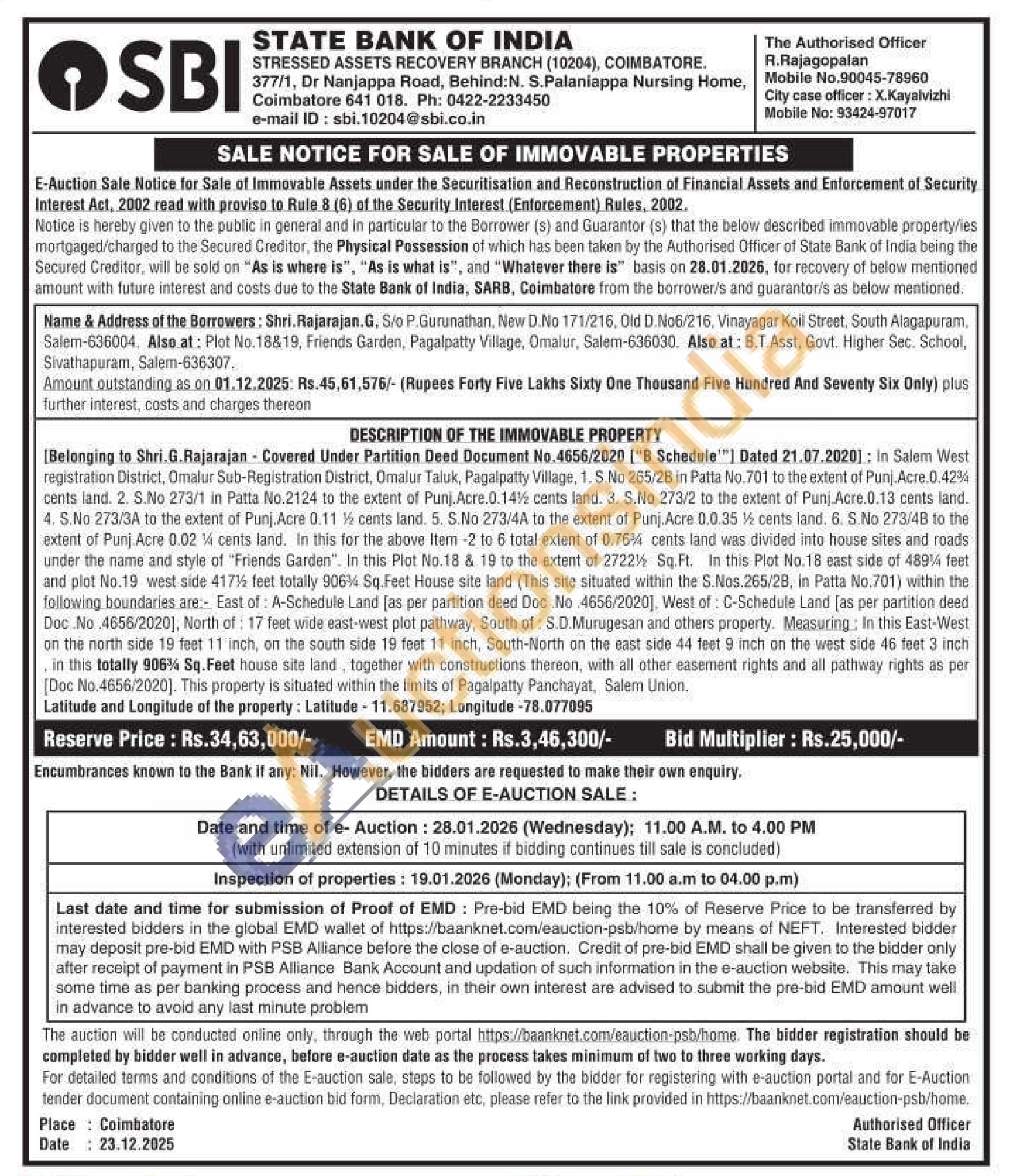 In Salem West registration District, Omalur Sub-Registration District, Omalur Taluk, Pagalpatty Village, 1. S. No 265/2B in Patta No.701 to the extent of Punj Acre.0.42% cents land. 2. S.No 273/1 in Patta No.2124 to the extent of Punj Acre 0.14% cents land. 3. S.No 273/2 to the extent of Punj.Acre.0.13 cents land. 4. S.No 273/3A to the extent of Punj. Acre 0.11% cents land. 5. S.No 273/4A to the extent of Punj.Acre 0.0.35 ½ cents land. 6. S.No 273/4B to the extent of Punj Acre 0.02 14 cents land. In this for the above Item 2 to 6 total extent of 0.76% cents land was divided into house sites and roads under the name and style of "Friends Garden". In this Plot No.18 & 19 to the extent of 2722 Sq.Ft. In this Plot No.18 east side of 489% feet and plot No.19 west side 417% feet totally 906% Sq. Feet House site land (This site situated within the S.Nos.265/28, in Patta No.701) within the following boundaries are: East of: A-Schedule Land [as per partition deed Doc. No.4656/2020] West of: C-Schedule Land [as per partition deed Doc No.4656/2020), North of: 17 feet wide east-west plot pathway, South of: S.D.Murugesan and others property. Measuring: In this East-West on the north side 19 feet 11 inch, on the south side 19 feet 11 inch, South-North on the east side 44 feet 9 inch on the west side 46 feet 3 inch in this totally 906% Sq. Feet house site land, together with constructions thereon, with all other easement rights and all pathway rights as per [Doc No.4656/2020]. This property is situated within the limits of Pagalpatty Panchayat, Salem Union,