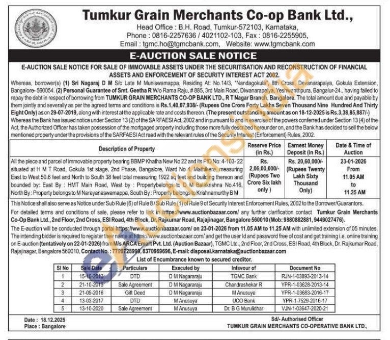 All the piece and parcel of immovable property bearing BBMP Khatha New No 22 and its PID No: 4-103-22 situated at HMT Road, Gokula 1st stage, 2nd Phase, Bangalore, Ward No 4, Mathikere, measuring East to West 50.6 feet and North to South 38 feet total measuring 1922 sq feet and building thereon and bounded by: East By: HMT Main Road, West by: Propertybelongs to D M Balakrishna No.416. North By: Property belongs to M Narayanaswamappa, South By: Property belongs to Krishnamurthy BM