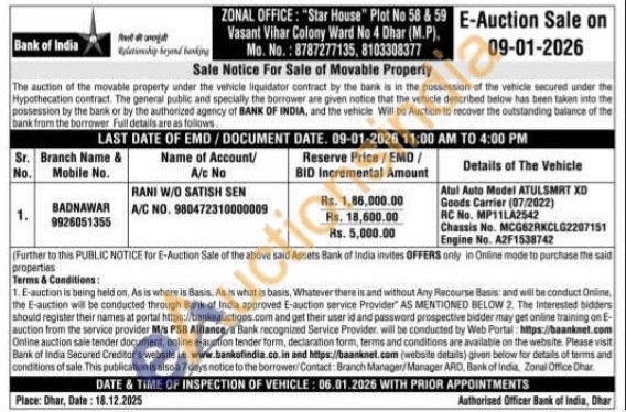 Atul Auto Model ATULSMRT XO Goods Carrier (07/2022) RC No. MP11LA2542 Chassis No. MCG62RKCLG2207151 Engine No. A2F1538742