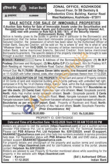 DETAILED DESCRIPTION OF THE PROPERTY: All the part and parcel of Property consists of 33 Cents of land and residential building and 2 Cents pathway with undinded hall night. comprised in R Sy No 14 of Chelora Vilage, Kannur Taluk, within the Sub registration District of Kadachira and Registration District of Kannur, owned by Mr. Pradeep MP Boundaries as per title deeds: (33 Cents) East: Rajeevanu njan vitta sthalam. West: Soopikade paramb North: Abdu Haji muthal randal kaivasam sthalam South Soopikade paramb. 2 Cents (1/2 undivided right): East: Ooduvazhi Road, West: Nangale kaivasam baakki: North: Nangale kaivasam bakki, South: Rajeevan kaivasam sthalavum ningale käivasam sthalavum Boundaries as per engineer report: East: Property of Rajeevan and Road, North: Soopikade Parambu: West: Property of Abu haji and others: South: Soopikade Parambu
