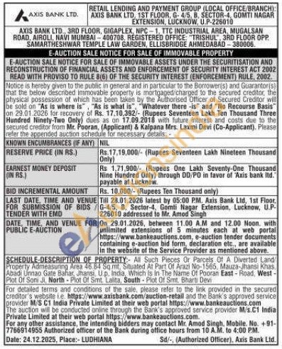 SCHEDULE-DESCRIPTION OF PROPERTY: All Such Pieces Or Parcels Of A Diverted Land Property Admeasuing Area 46 84 Sq mmt. Situated At Part Of Arazi No-1565. Mauza Jhansi Khas Abadi Unnao Gate Bahar, Jhansi. Up. India, Which Which is in The Name Of Pooran East-Road, West-Plot Of Soni Ji, North-Plot Of Smt. Lalita, South-Plot Of Smt. Bharti Devi